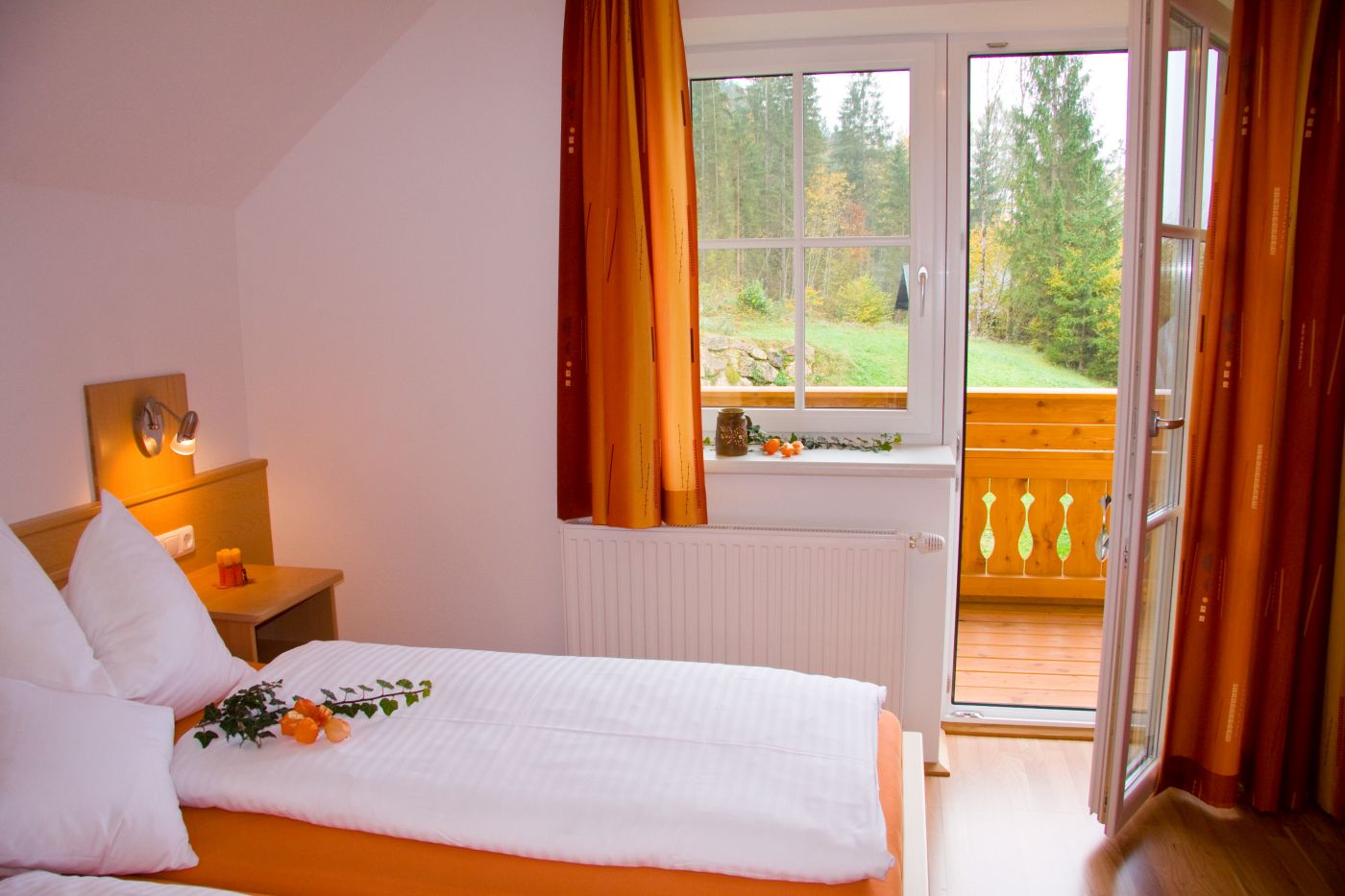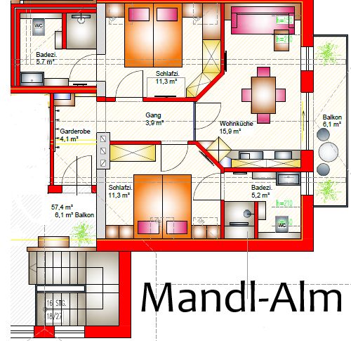 Zwei getrennte Schlafzimmer mit jeweils eigenem Badezimmer. Genießen Sie die Abendsonne und den Ausblick auf den Großen Priel vom Balkon der „Mandl Alm“ .
