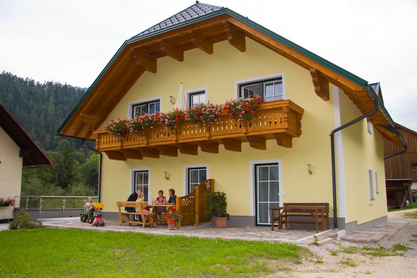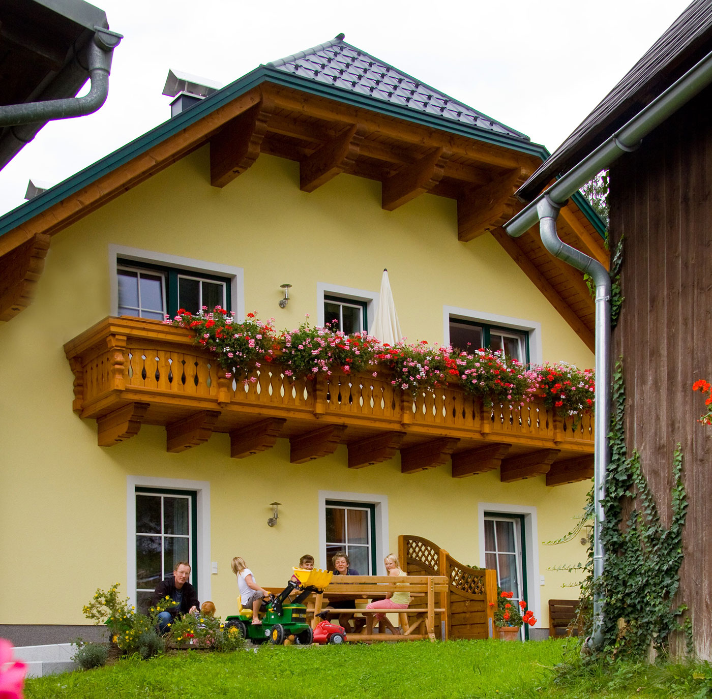 Die „Schmalzer Alm“ ist im Erdgeschoss unseres Gästehauses mit großer Terrasse und direktem Zugang zum Spielplatz. Frühstücken Sie auf der Terrasse und lassen Sie sich von der Morgensonne wärmen.