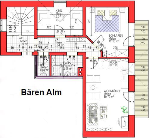 Im Dachgeschoss gleich neben der Sauna befindet sich die „Bären Alm“. Ein Schlafzimmer für die Eltern und ein Kinderschlafzimmer – Betten in L-Form. Wohlfühlen in der geräumigen Wohnküche und am großen Balkon.