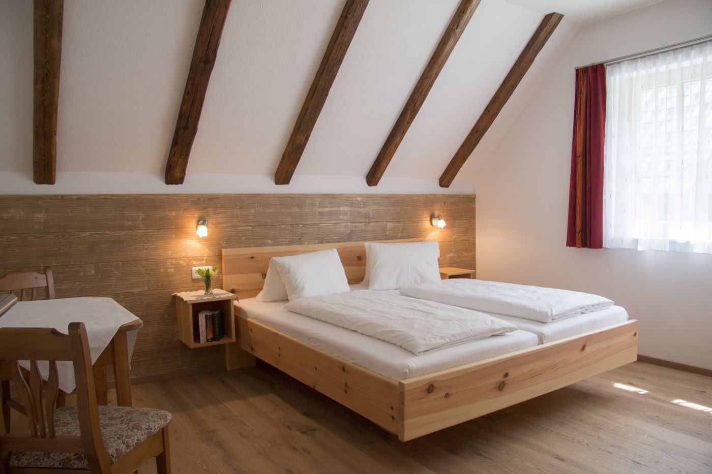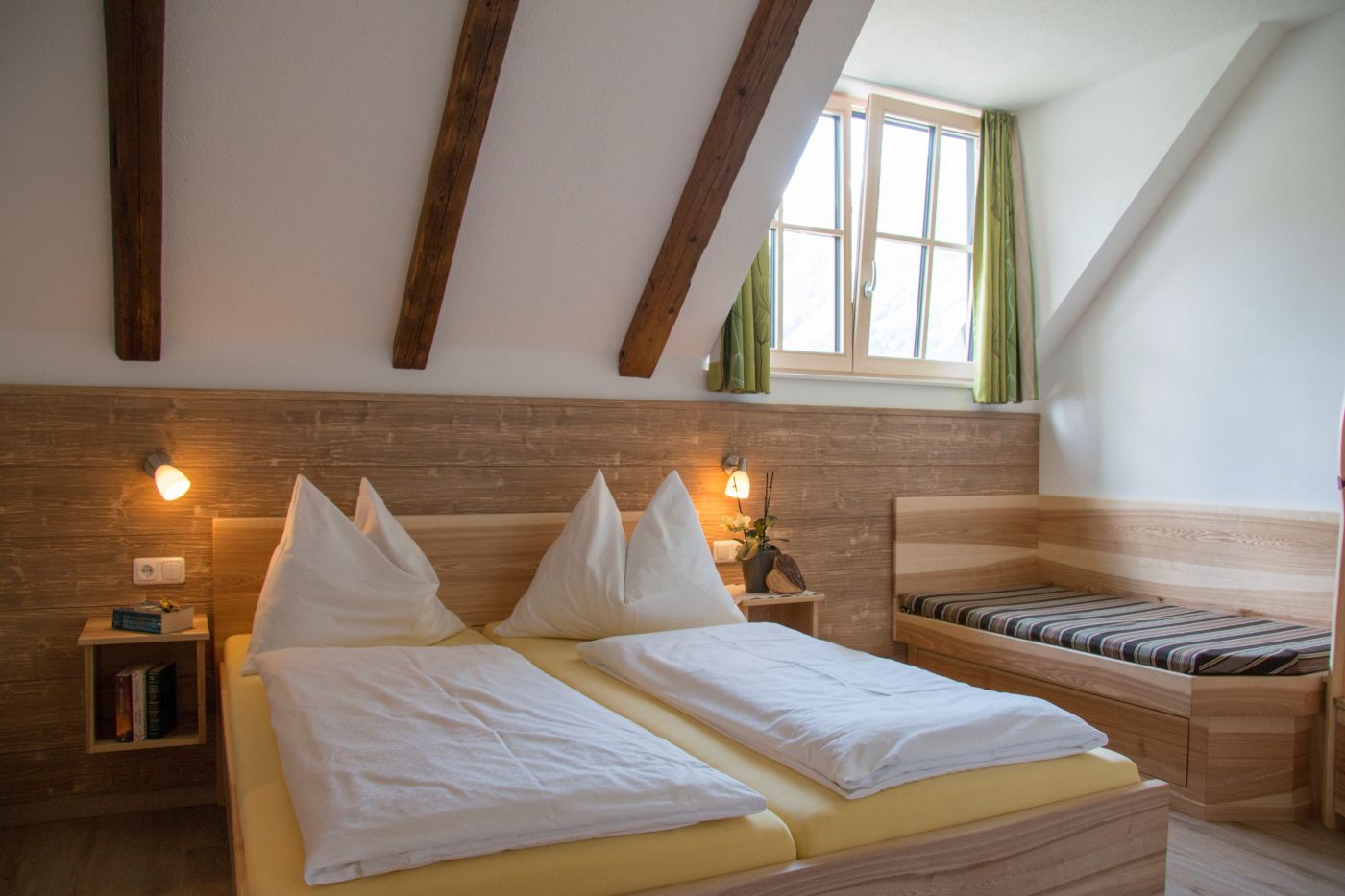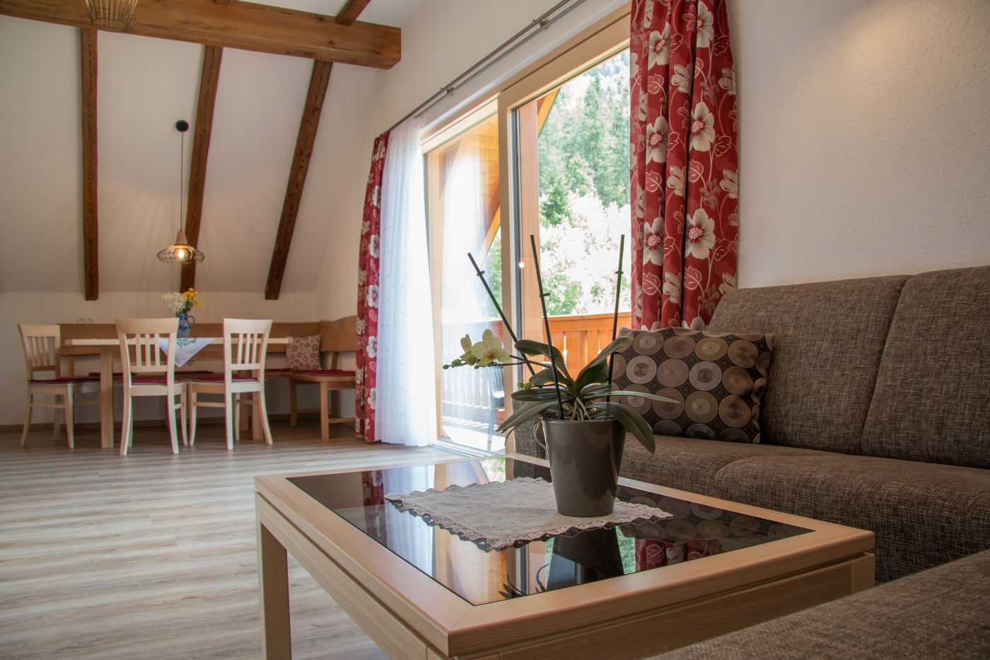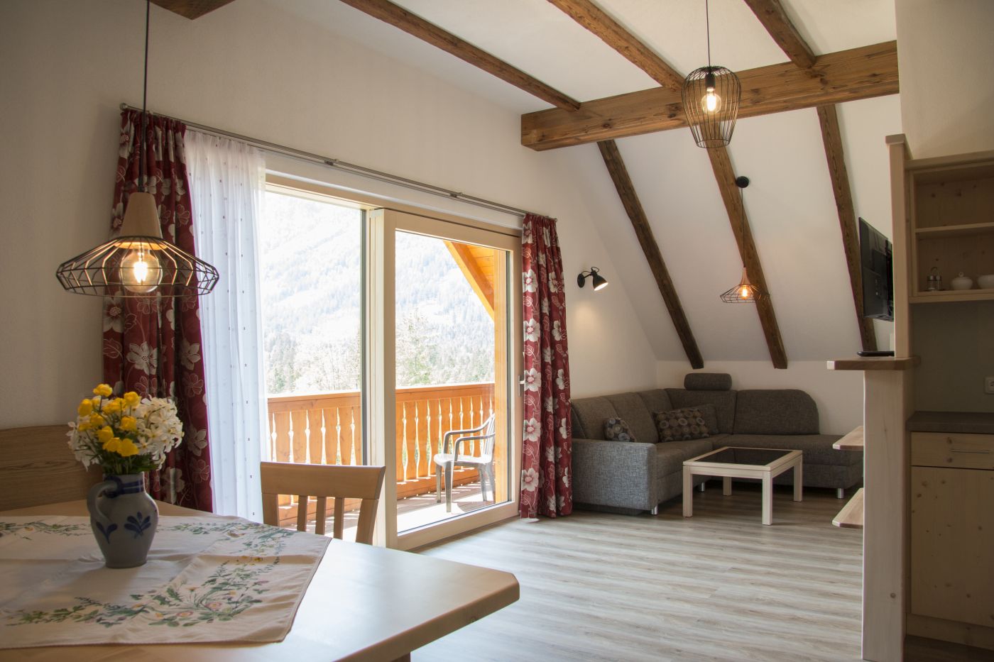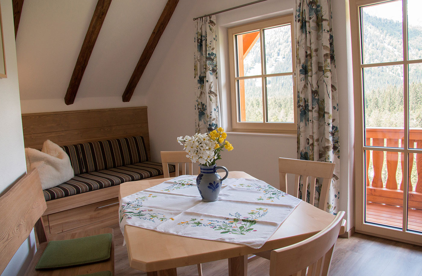 Unsere gemütlichen Ferienwohnungen sind mit viel heimischem Holz eingerichtet und haben Balkons oder Terrassen nach Süden, mit herrlicher Aussicht auf viele Gipfeln der Kalkalpen.
