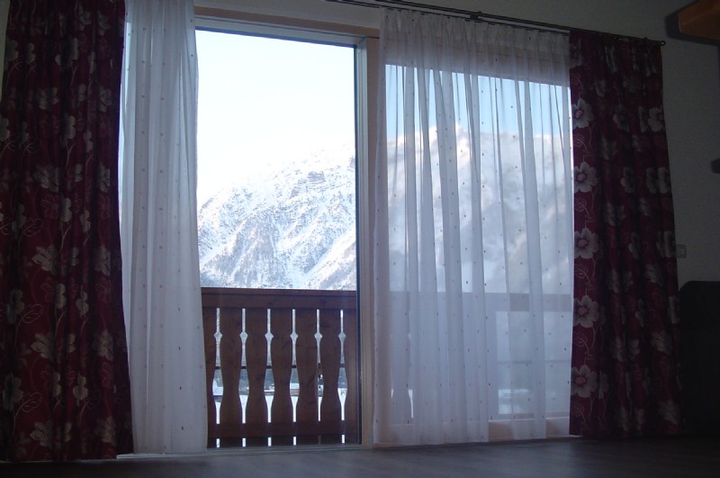 großer Balkon - Blick auf den Garten mit Bergpanorama